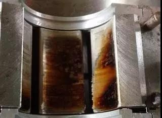 軸承間隙調(diào)整過小同樣會造成的軸瓦的高溫燒毀,如圖B增速器高速軸徑向軸瓦嚴重燒毀現(xiàn)象。