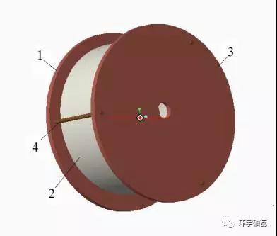 圖1所示離心澆鑄裝置的三維簡易模型,其中1—底板,2—工件,3—上壓板,4—緊固螺栓(三處均布)。同時,在上壓板處開有巴氏合金澆鑄口。值得強(qiáng)調(diào)的是,考慮實(shí)際狀況工件、相關(guān)部件的質(zhì)量分布不均勻以及裝夾偏置,筆者預(yù)設(shè)工件偏心距e=15mm。
