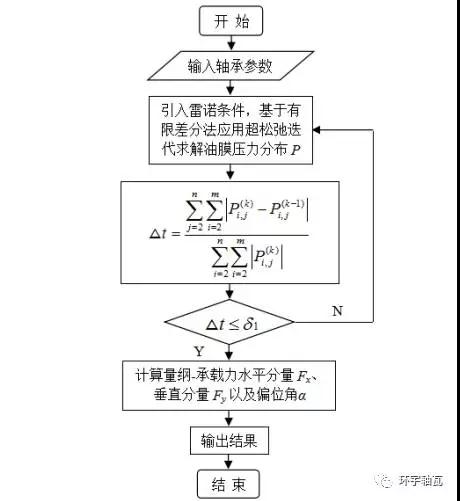 根據(jù)此組壓力值,再用相應(yīng)的數(shù)值積分,便可進一步求得穩(wěn)態(tài)條件下軸承油膜承載力,其計算流程如圖2。