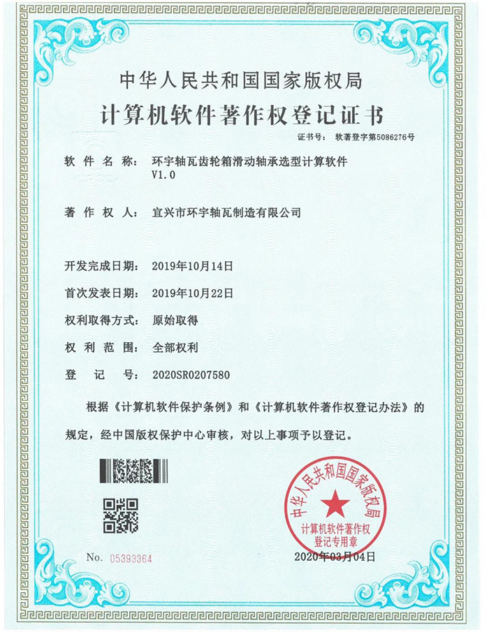 3月,環(huán)宇軸瓦開發(fā)的《齒輪箱滑動(dòng)軸承選型計(jì)算軟件》完成登記。