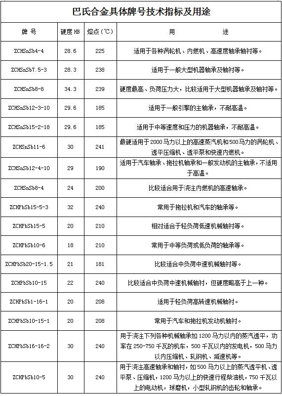 按國家標(biāo)準(zhǔn),巴氏合金可以分為錫基合金和鉛基合金兩種。鉛基合金的強(qiáng)度和硬度比錫基合金低,耐蝕性也差。所以客戶在使用巴氏合金的時(shí)候,通常選用錫基合金,其常用的牌號有11-6、8-4、8-8等。盡管鉛基合金的性能沒有錫基合金好,但是有許多客戶仍然選擇使用,因?yàn)樗褂闷饋肀容^經(jīng)濟(jì),其常用的牌號有16-16-2、15-5等。